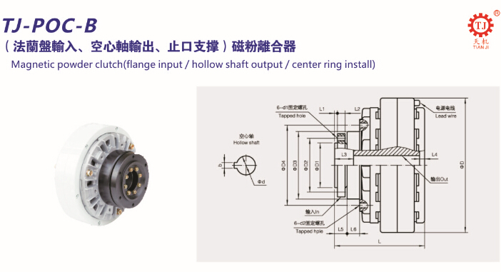 臺灣天機(TJ-POC-B)中空軸磁粉離合器法蘭輸入、空心軸輸出、止口支撐、內殼旋轉,采用DC24V,進口軸承、磁粉,精度小于0.01mm。天機傳動率先通過ISO9001:2008標準質量管理系統認證,建立完善的質量管理體質、服務體系。天機傳動成立至今,一直專注于工業領域專用的磁粉離合器/制動器及電磁離合器/制動器等系列傳動設備的研發、設計、生產。