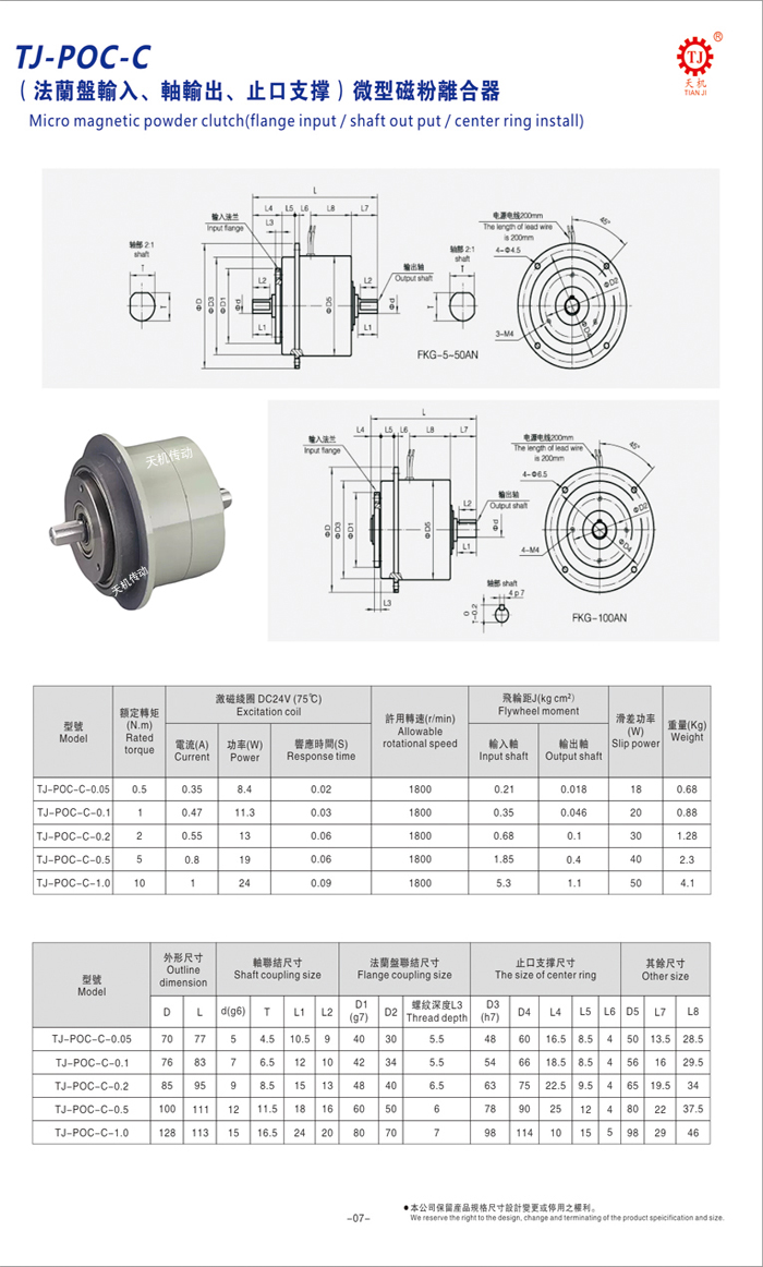 天機傳動(TJ-POC-C)小型號磁粉離合器,微型磁粉離合器的激磁電流雖小,但卻可以輸出較大轉矩,從而可以很方便地組成自動控制系統。此外當激磁電流發生變化時,與之對應的磁場強度也隨之同步響應,而也因此具備優越的響應速度。當激磁電流保持不變時,其輸出之轉矩不受傳動件與從動件之間差速(滑差轉速)之影響,即靜力矩與動轉矩無差別。因此可以非常穩定地輸出恒定轉矩。此特性若應用于張力控制,則只須調節激磁電流之大小,便可簡潔、有效、準確地達到控制卷料張力的目的。