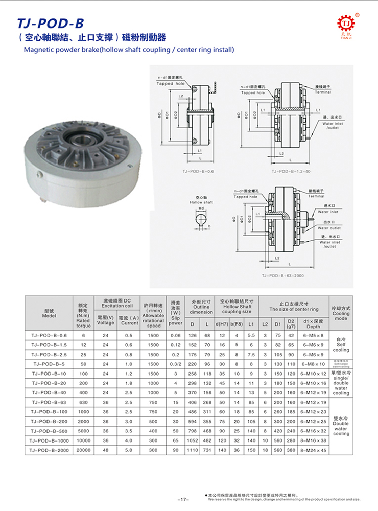 該型TJ-POD-B為內(nèi)殼旋轉(zhuǎn)、空心軸磁粉制動器(剎車器),采用進(jìn)口軸承、磁粉及100%使用漆包線圈等,可大大提高制動器壽命、線性度、性能。廣泛應(yīng)用于造紙、印刷、 塑料、橡膠、紡織、印染、電線電纜、冶金以及其他有關(guān)卷取加工行業(yè)中的放卷和收卷張力控制。其特點如下: