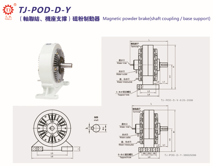 單軸機座式磁粉制動器(TJ-POD-D-Y)的安裝尺寸及型號參數如下: