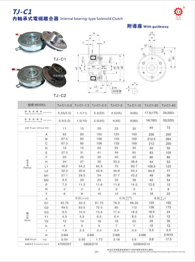 天機傳動該型為軸承式電磁離合器(TJ-C1內軸承安裝型)附帶鋁導座,CNC電腦鉆孔。CNC電腦加工,采用最佳導磁材質來令片(高級非石棉來令片),提高摩擦系數及使用壽命、性能。使用安全電壓DC24V,扭矩規格在6Nm~400Nm,規格型號齊全。適用于連結、切離、變速、寸動、過載保護及正反轉(如何實現正反轉功能)等多用途。軸承安裝型電磁離合器的工作原理是:當線圈有通電時產生磁力吸合“銜鐵”片,離合器處于接合狀態;線圈斷電時“銜鐵”彈回,離合器處于分離狀態。注意,這里指是通電是額定電壓DC24V。