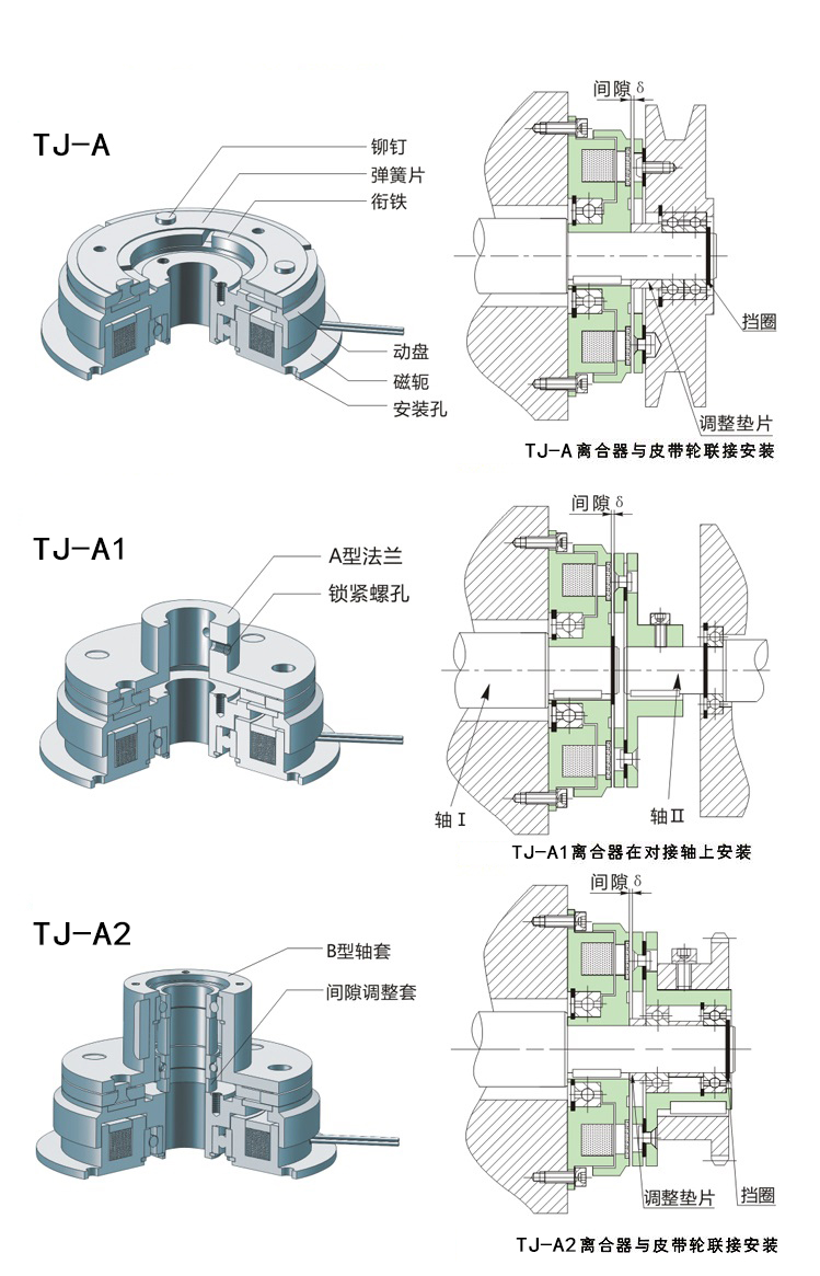 關(guān)于安裝尺寸規(guī)格參數(shù)說明,皮帶輪的尺寸規(guī)格暫時沒有,請參考TJ-A型干式單片電磁離合器。