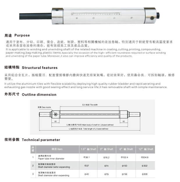 天機傳動廠家生產的瓦片式氣脹軸又稱板條式氣脹軸,由氣脹軸(氣漲軸)和長條脹瓦兩部分組成。瓦片式氣脹軸采用鋁合金板條,具有經濟效率高、承載量大、紙管放置簡單、充氣時間短、可拆卸軸頭、保養維修簡便等等優點。